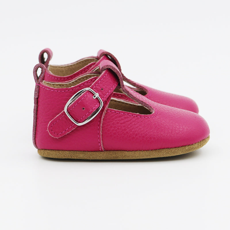 Rose Pre-walker Leather T-Bar Handmade Shoes - Happy Pink